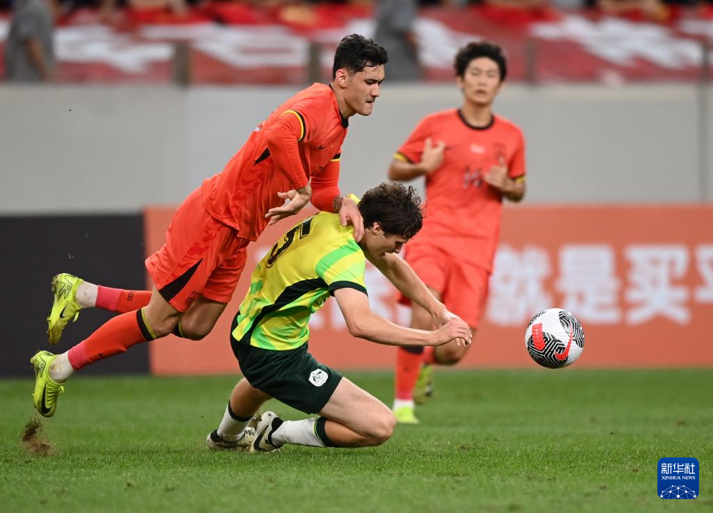 9月9日★★★,中国队球员王钰栋(右)与澳大利亚队球员基利·亚当森在比赛中拼抢★★★。